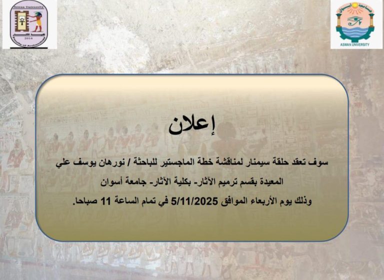 تُعلن كلية الآثار بجامعة أسوان عن عقد حلقة سيمنار علمي لمناقشة خطة رسالة الماجستير المقدمة من الباحثة نورهان يوسف علي،…