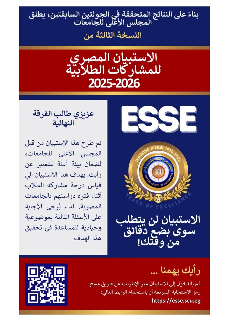في إطار الالتزام بتعليمات المجلس الأعلى للجامعات، تهيب إدارة الكلية بالسادة طلاب الفرق النهائية ضرورة سرعة ملء الاستبانة المرفقة، مع…