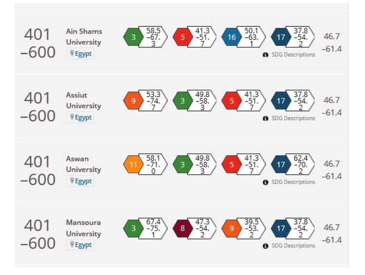 والمركز 201-300 في الشراكات الحكومية وفي هدف العدالة والمساواة ومركز 301-400 في جودة التعليم والخدمات الصحية وأضاف الدكتور /أحمد غلاب