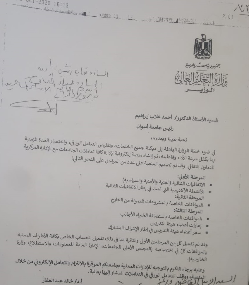 في ضوء خطة الوزارة الهادفة إلي ميكنة جميع الخدمات وتقليص التعامل الورقي واختصار المدة الزمنية بما يكفل سرعة الأداء وفاعليته تم إنشاء منصة إلكترونية لإدارة كافة تعاملات الجامعات مع الإدارة المركزية للتعاون الثقافي وقد تم تصميم المنصة علي ثلاث مراحل تم تفعيل كل من المرحلتين الأولي والثانية بما في ذلك تفعيل الحساب الخاص بكافة الأطراف المعنية بالموافقات كل في اختصاصه وعليه برجاء التكرم بالتوجيه للإدارات المعنية بالجامعة للإلتزام بالتعامل الإلكتروني من خلال المنصة ووقف التعامل الورقي في التعاملات المشار إليها بالخطاب التالي