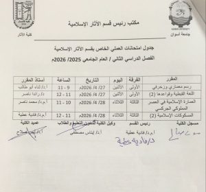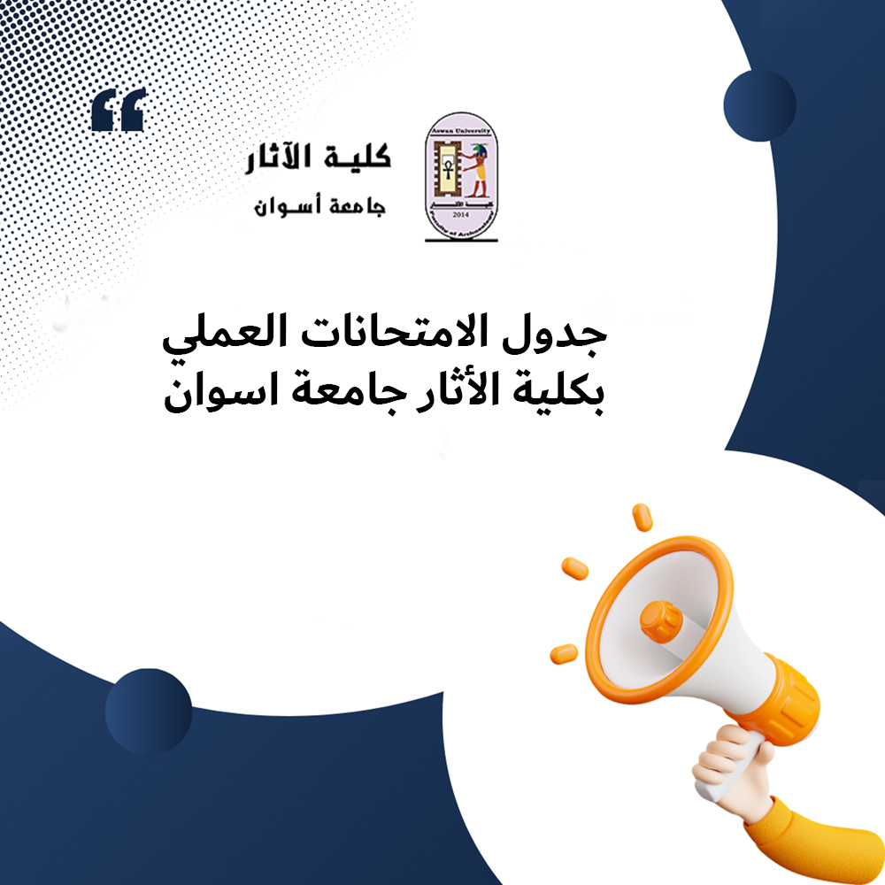 تُعلن كلية الآثار – جامعة أسوان عن جداول امتحانات العملي الخاصة بالطلاب، وذلك في إطار الاستعدادات الجارية لاستكمال أعمال الامتحانات وفق الخطة الأكاديمية المعتمدة للكلية.