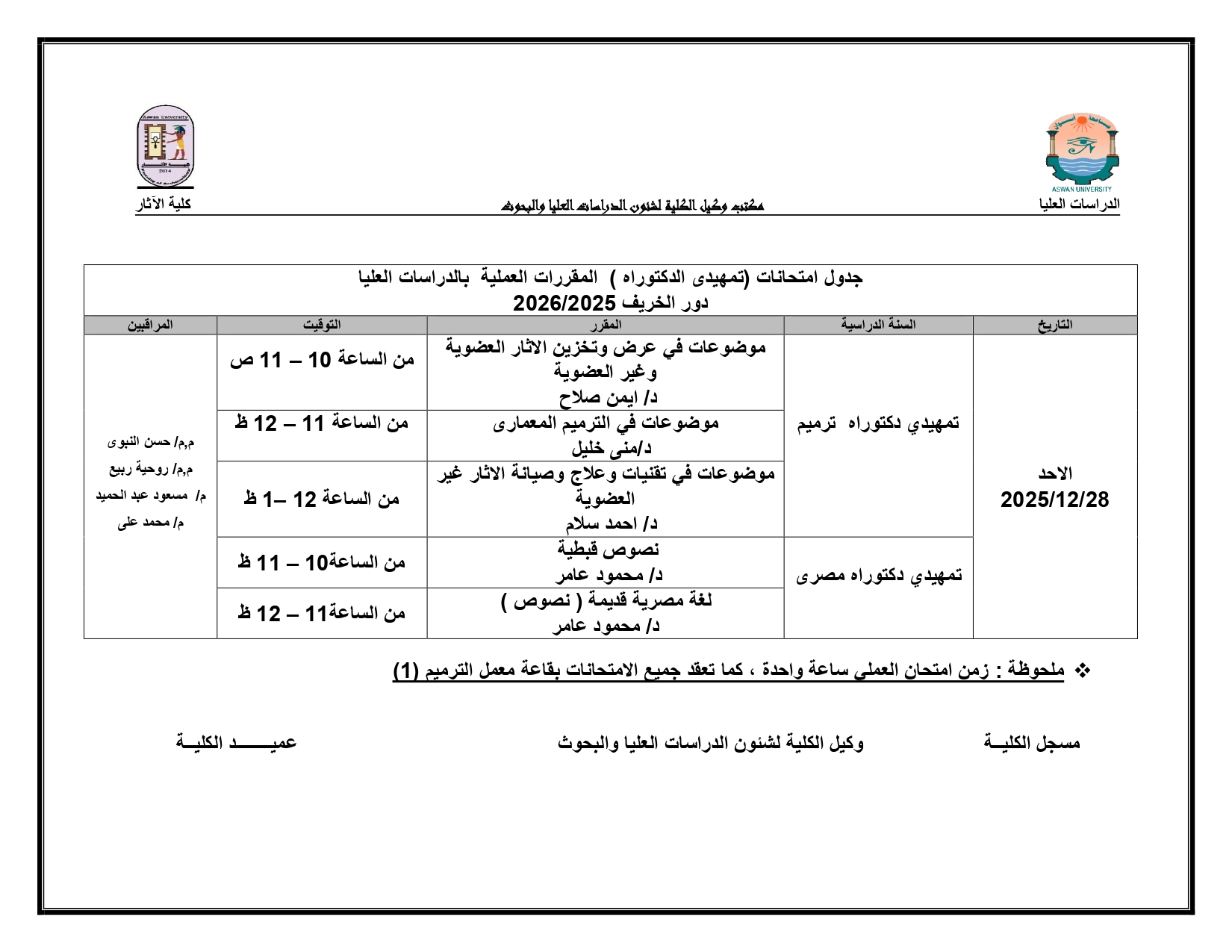 تعلن كلية الآثار – جامعة أسوان عن نشر جدول امتحانات المقررات العملية لمرحلة تمهيدي الدكتوراه بالدراسات العليا، وذلك لدور الخريف للعام الجامعي 2025/2026.
