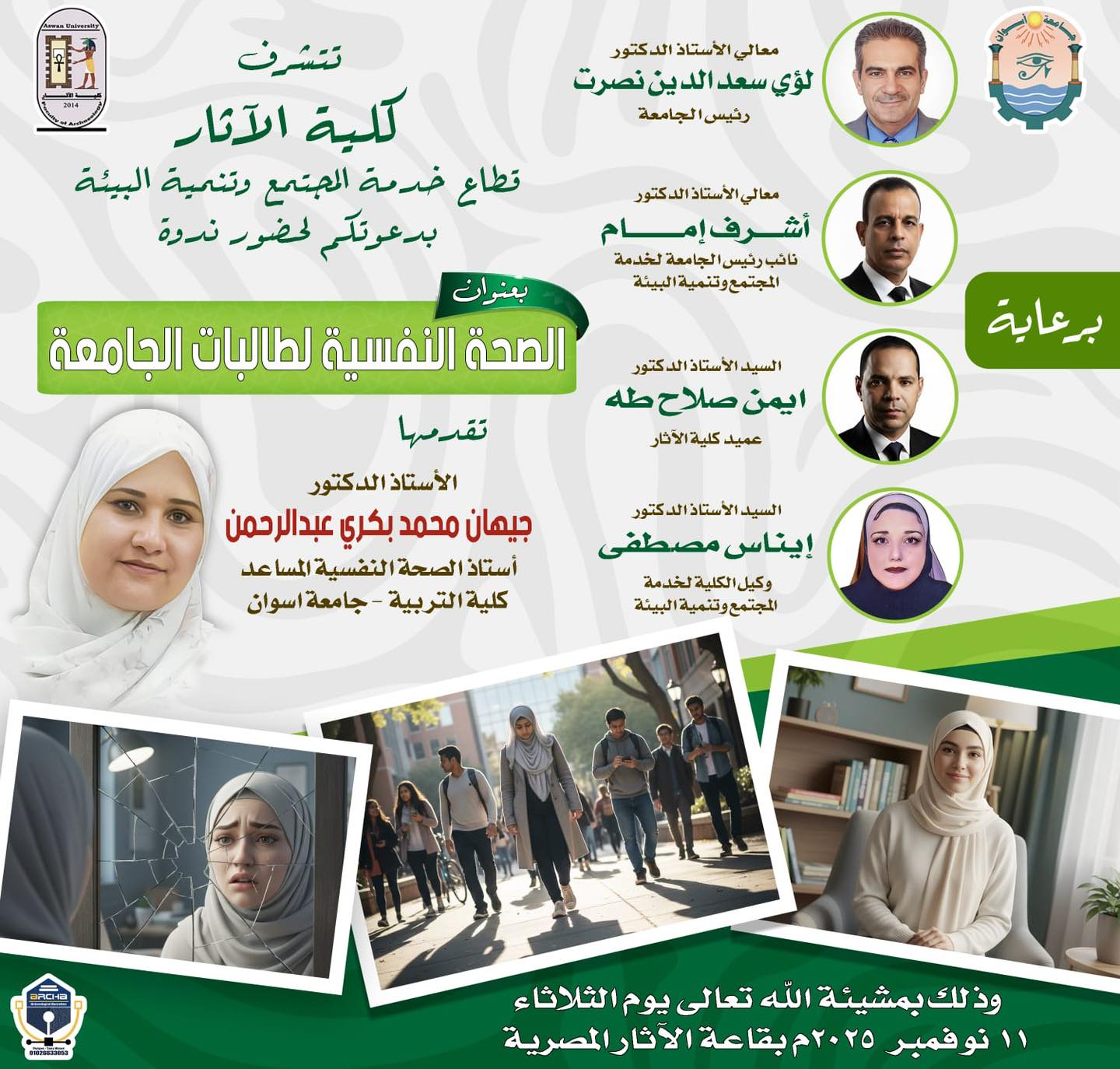 ستنظم كلية الآثار – قطاع خدمة المجتمع وتنمية البيئة ندوة توعوية بعنوان “الصحة النفسية لطالبات الجامعة”.
