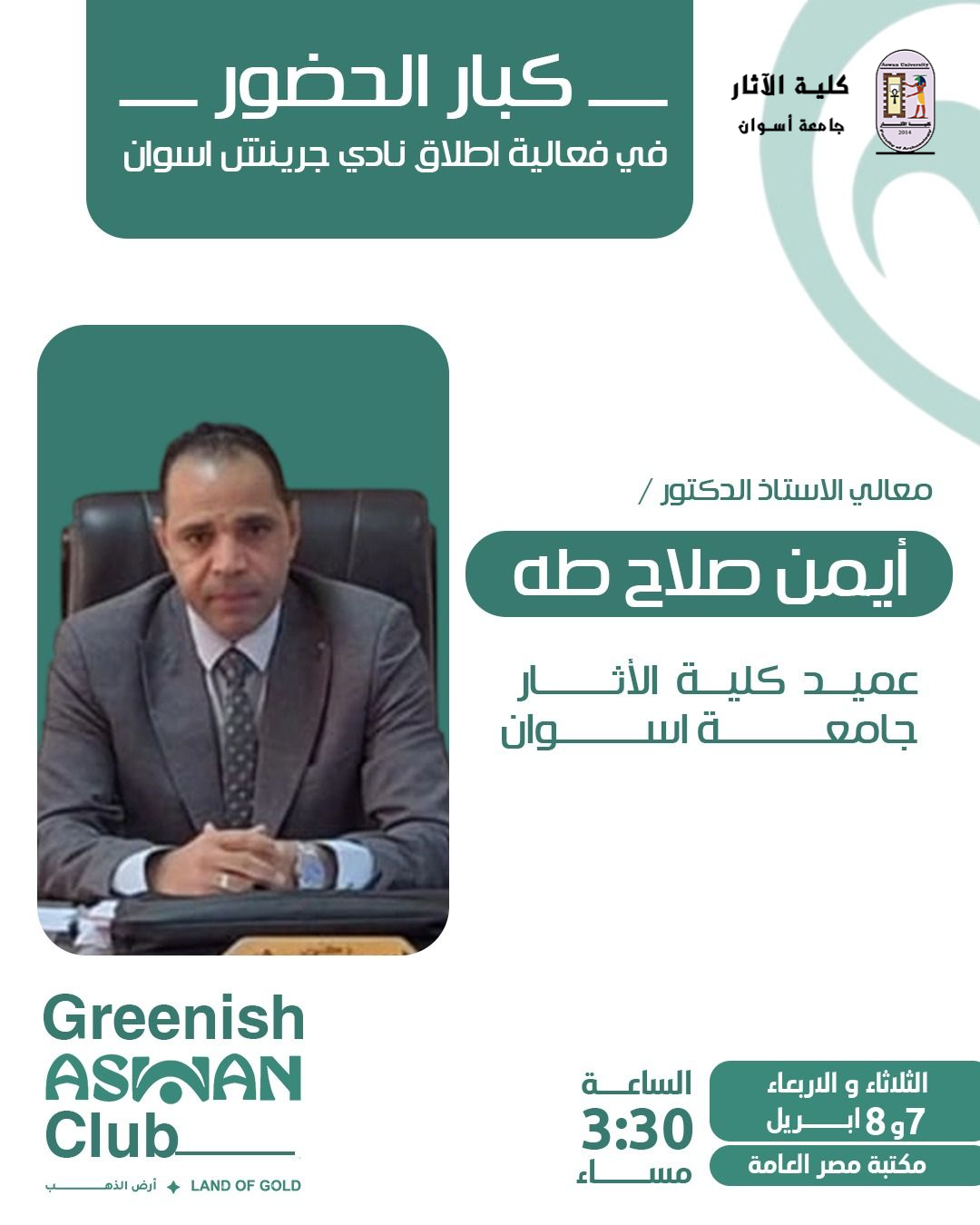 في إطار دعم جامعة أسوان للمبادرات الشبابية والأنشطة المجتمعية الهادفة، أعلن نادي “جرينش” أسوان عن تشرفه بحضور السيد الأستاذ الدكتور أيمن صلاح طه، عميد كلية الآثار بجامعة أسوان، كضيف شرف في حفل إطلاق النادي.