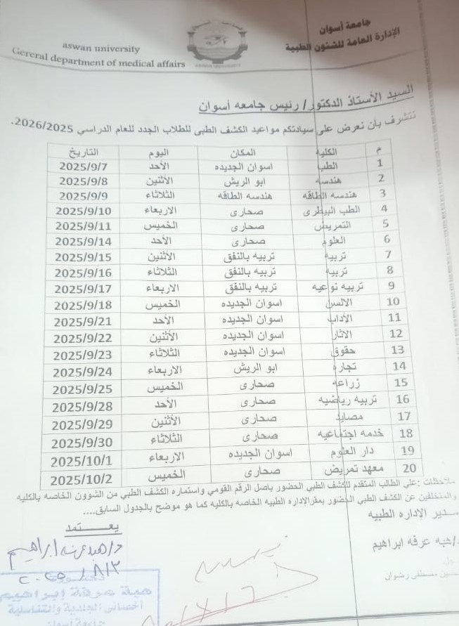 تعلن كلية الآثار – جامعة أسوان عن تحديد موعد الكشف الطبي للطلاب الجدد المقبولين للعام الجامعى 2025 _ 2026 ، وذلك يوم الأثنين الموافق 22 سبتمبر 2025 بمقر الإدارة الطبية بالجامعة اسوان الجديدة .