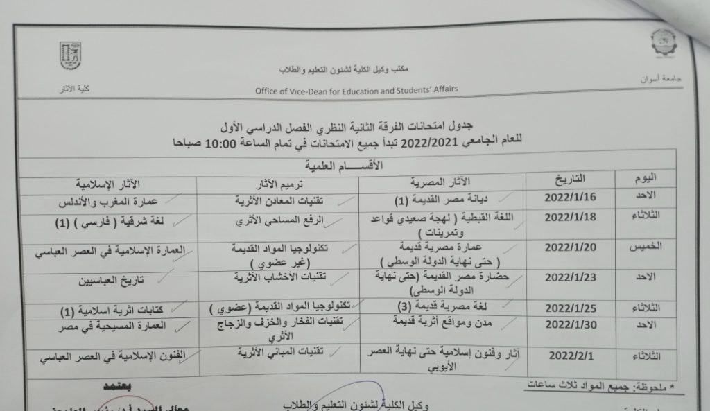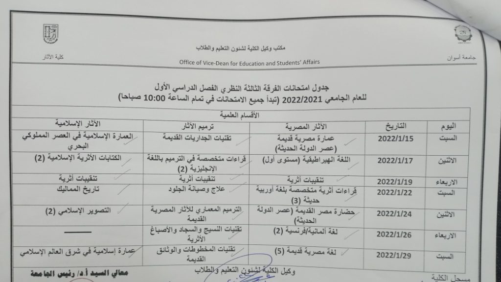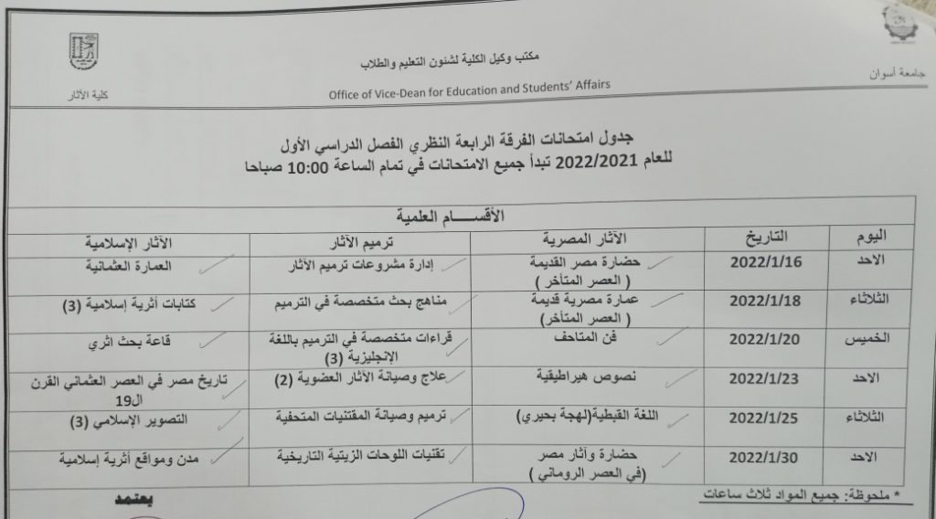 تعلن كلية الآثار عن جداول امتحانات النظري للفصل الدراسي الأول للعام الجامعي ٢٠٢١/٢٠٢٢ للأقسام الثلاثة كالآتي:. editor