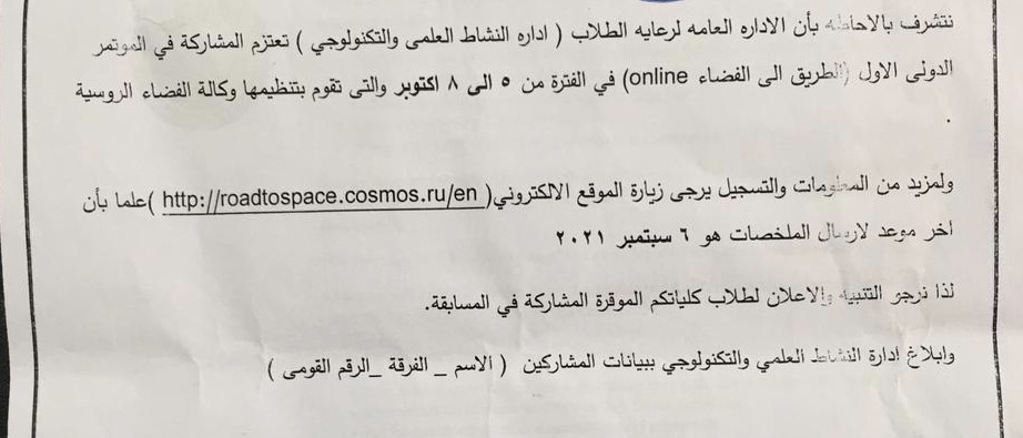 تتشرف الإدارة العامة لرعاية الشباب إدارة النشاط العلمي والتكنولوجي بدعوتكم للمشاركة في المؤتمر الدولي الأول “الطريق إلي الفضاء” في الفترة ٥-٨ اكتوبر ٢٠٢١ والتي تقوم بتغطيها وكالة الفضاء الروسية editor