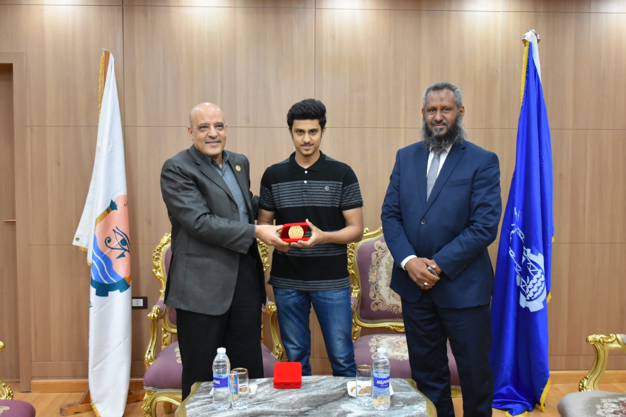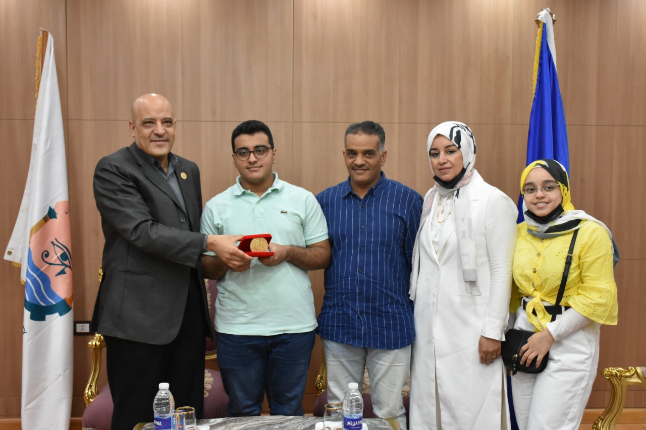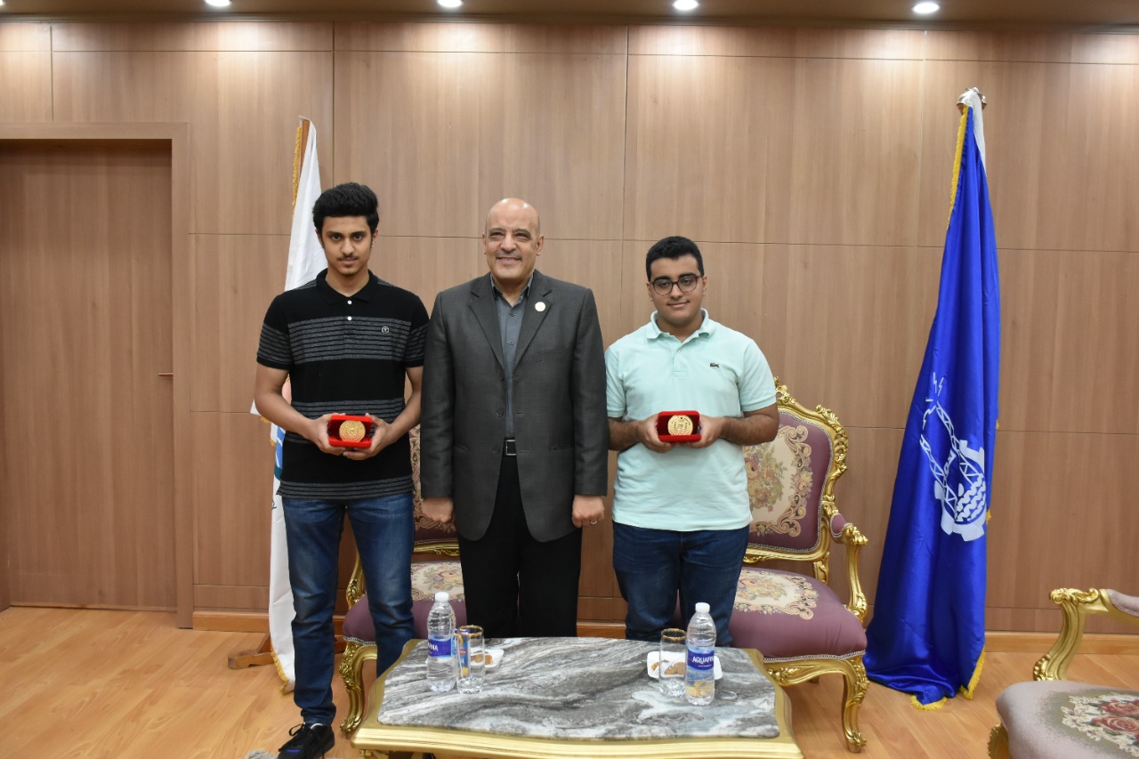 كما قدم سيادته أجمل وأرق التهانى القلبية لكلا من الطالب محمد هانى محمد أحمد مدرسة السلام أكاديمى والطالب عبد الله أيمن محمد سمير رضوان مدرسة أحمد طه حسين بعد حصولهم على المركزين الثالث و الرابع فى القائمة النهائية لأوائل الثانوية العامة على مستوى الجمهورية شعبة علمى رياضة ولجميع طلاب الثانوية العامة الناجحين متمنيا لهم دوام التوفيق والنجاح وقدم لهما درع الجامعة وحثهم علي التفوق وتحقيق المراكز الأولي العملية.