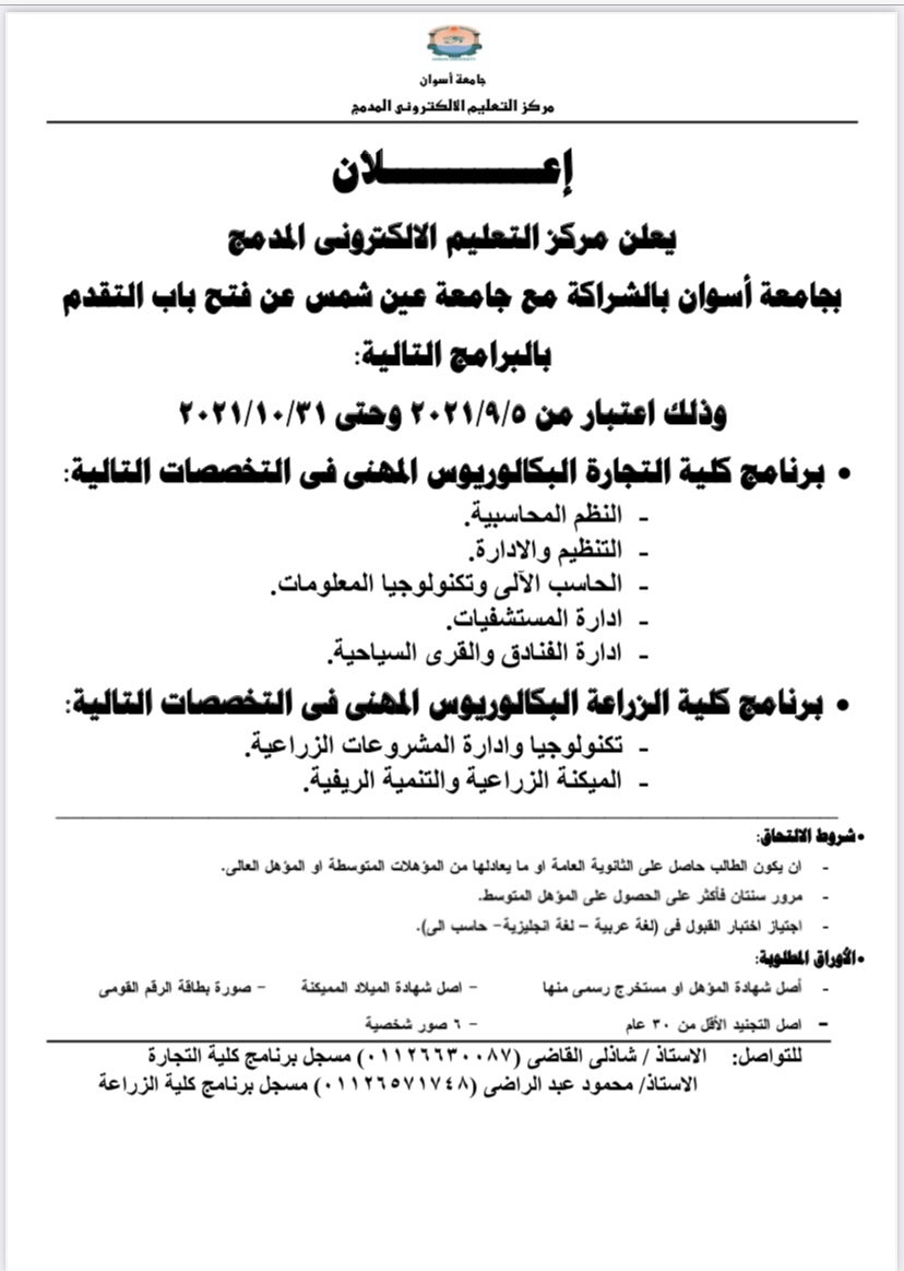 يعلن مركز التعليم المدمج بجامعة أسوان بالشراكة مع جامعة عين شمس عن قبول دفعة جديدة وفتح باب التقديم خلال الفترة من 5/9/2021 وحتي 31/10/2021 editor