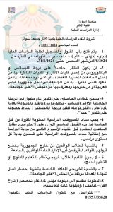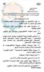 على الطلاب الراغبين في الالتحاق التوجه إلى إدارة الدراسات العليا خلال هذه الفترة